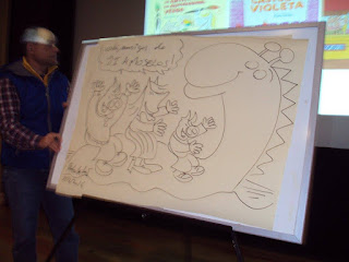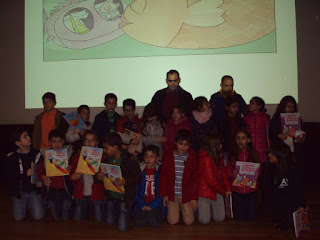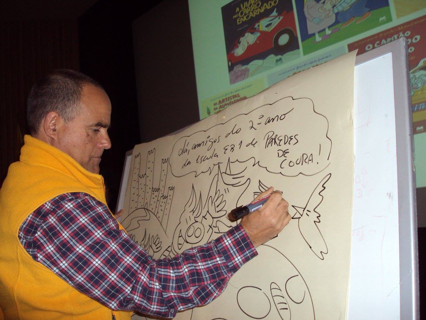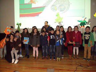 O autor contou, de uma forma muito animada, uma história em cada sessão, fez um desenho para oferecer a cada ano e deu autógrafos com um desenho personalizado em cada livro. Os alunos fizeram decorações, uma entrevista e cartazes para mostrar ao autor o interesse pela sua obra. Foi uma partilha muito interessante.